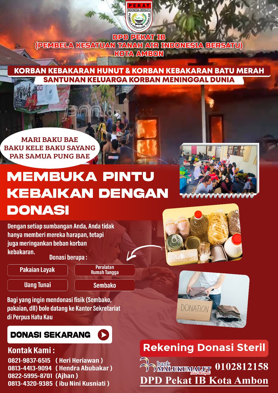 MataNasional.co.id., AMBON – Sabtu 23 Agustus 2025, Dewan Pimpinan Daerah (DPD) Pembela Kesatuan Tanah Air Indonesia Bersatu (PEKAT IB) Kota Ambon mengambil langkah cepat dengan menggalang donasi untuk membantu para pengungsi korban kebakaran di Desa Hunut dan Negeri Batu Merah. Aksi ini merupakan bentuk kepedulian dan solidaritas PEKAT IB terhadap warga Ambon yang sedang tertimpa musibah.