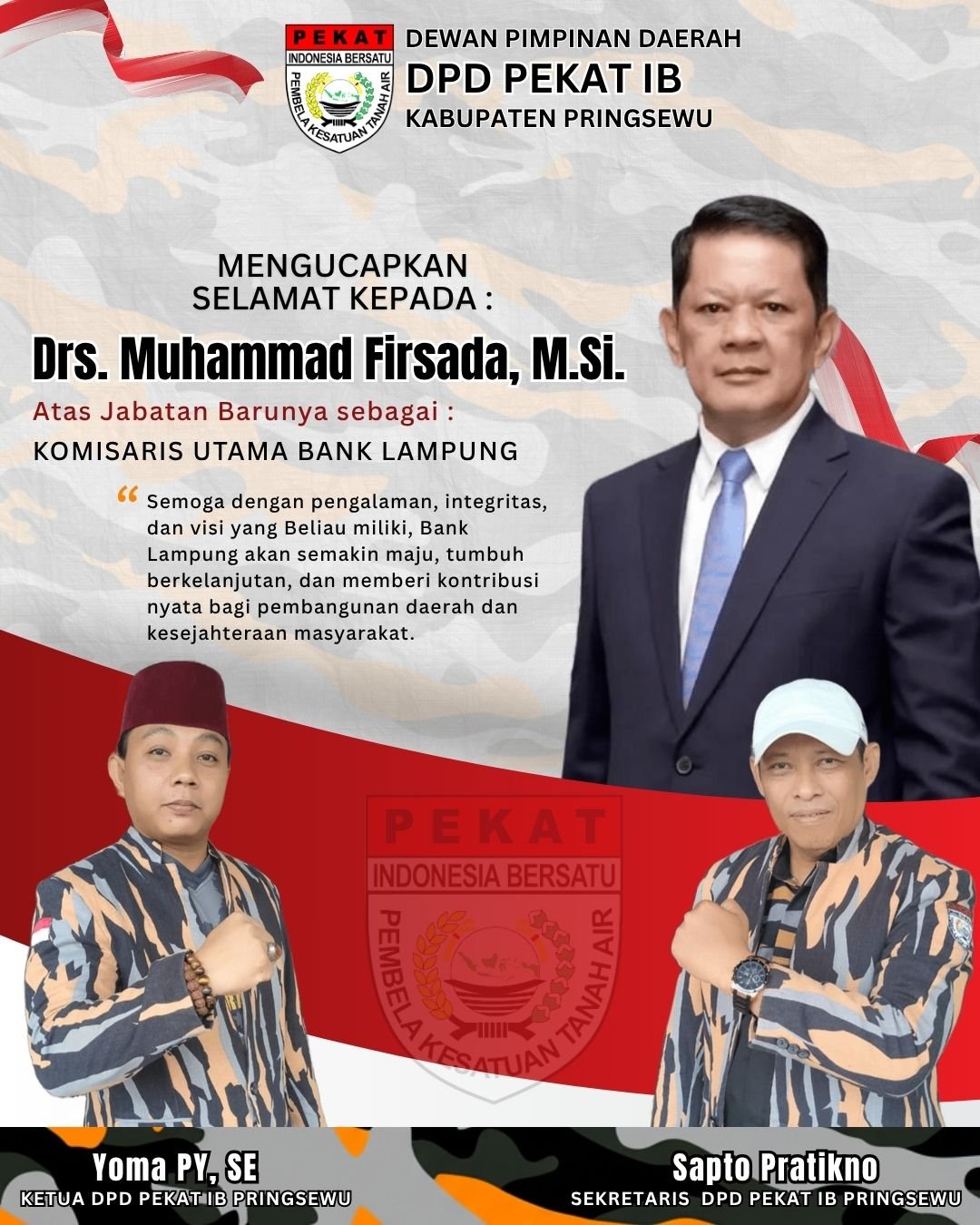 Pringsewu – Mata Nasional — Dewan Pimpinan Daerah Pembela Kesatuan Tanah Air Indonesia Bersatu (DPD PEKAT IB) Kabupaten Pringsewu menyampaikan ucapan selamat dan sukses atas pelantikan Drs. Muhammad Firsada sebagai Komisaris Utama Bank Lampung, berdasarkan hasil Rapat Umum Pemegang Saham Luar Biasa (RUPS-LB) pada Sabtu, 5 Juli 2025, di Swiss-Belhotel Bandar Lampung.